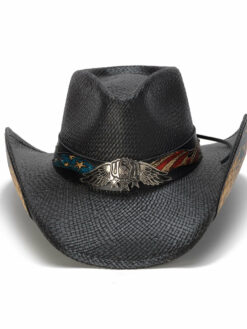 Black Eagle Straw Cowboy Hat, It has a 3 1/2″ brim and a 4 1/4″ pinch front teardrop crown. It features a quality Panama Straw and USA logo with wings and stars buckle. This one-of-a-kind piece makes a bold statement of patriotism.Lightweight and durable, it’s unlined for breathability.