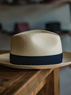 Casual Chic Straw Hat, This is a medium height centre dent panama with 7 cm / 2.75 in – 8 cm / 3.15 in brim. It features 38 mm puggaree hatband.