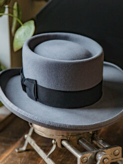 Classic Charm Pork Pie Fur Felt Hat in Grey, a timeless accessory that combines elegance and style. Crafted from premium fur felt, this hat features a distinctive flat crown and a narrow brim, providing a sophisticated yet casual look.
