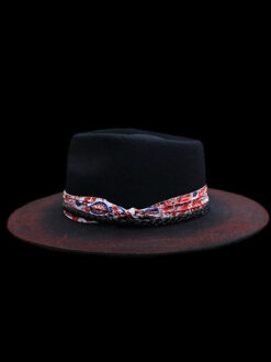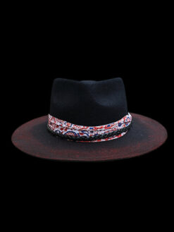 “Distressed Fedora with Red and White Patterned Band” is hand-distressed, hand-dyed, and hand-torched, ensuring no two share the same color or design. Each piece is uniquely imperfect, with subtle variations from product images.