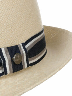 Panama straw is the summery material of choice for this trilby and has been carefully woven using traditional handcrafting methods. The straw hat with a characteristically shaped crown and brim feels airy and lightweight atop the head and flatters the wearer with its plain-coloured design. This is complemented by a stylish, colourfully striped grosgrain ribbon trim with brand pin, which adds the visual finishing touch.