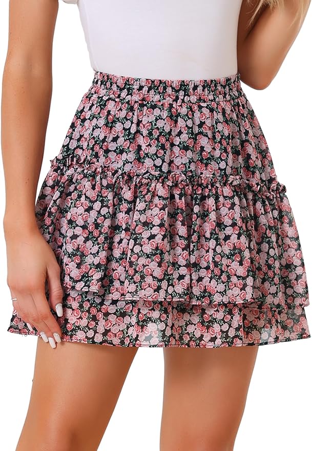 - Layered Mini Skirt, Fully Lined, Allover Floral Pattern, Ruffled Trim, A-Line, Elastic High Waist