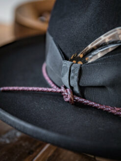 Modern Felt Hat, This is a medium height centre dent with 7 cm / 2.75 in overwelt pencil roll brim. It features 38 mm modern grosgrain hatband with a double back bow & leather cord.