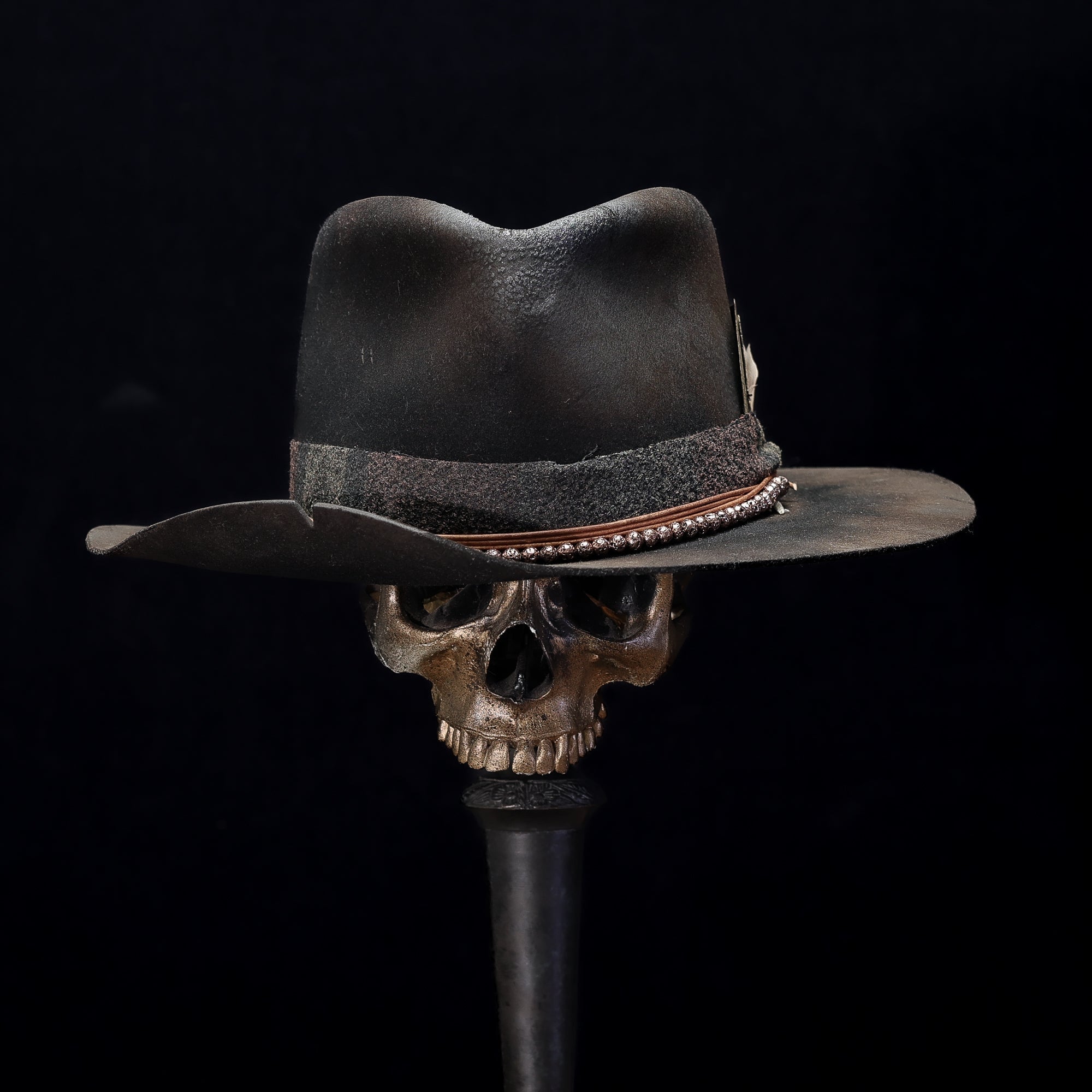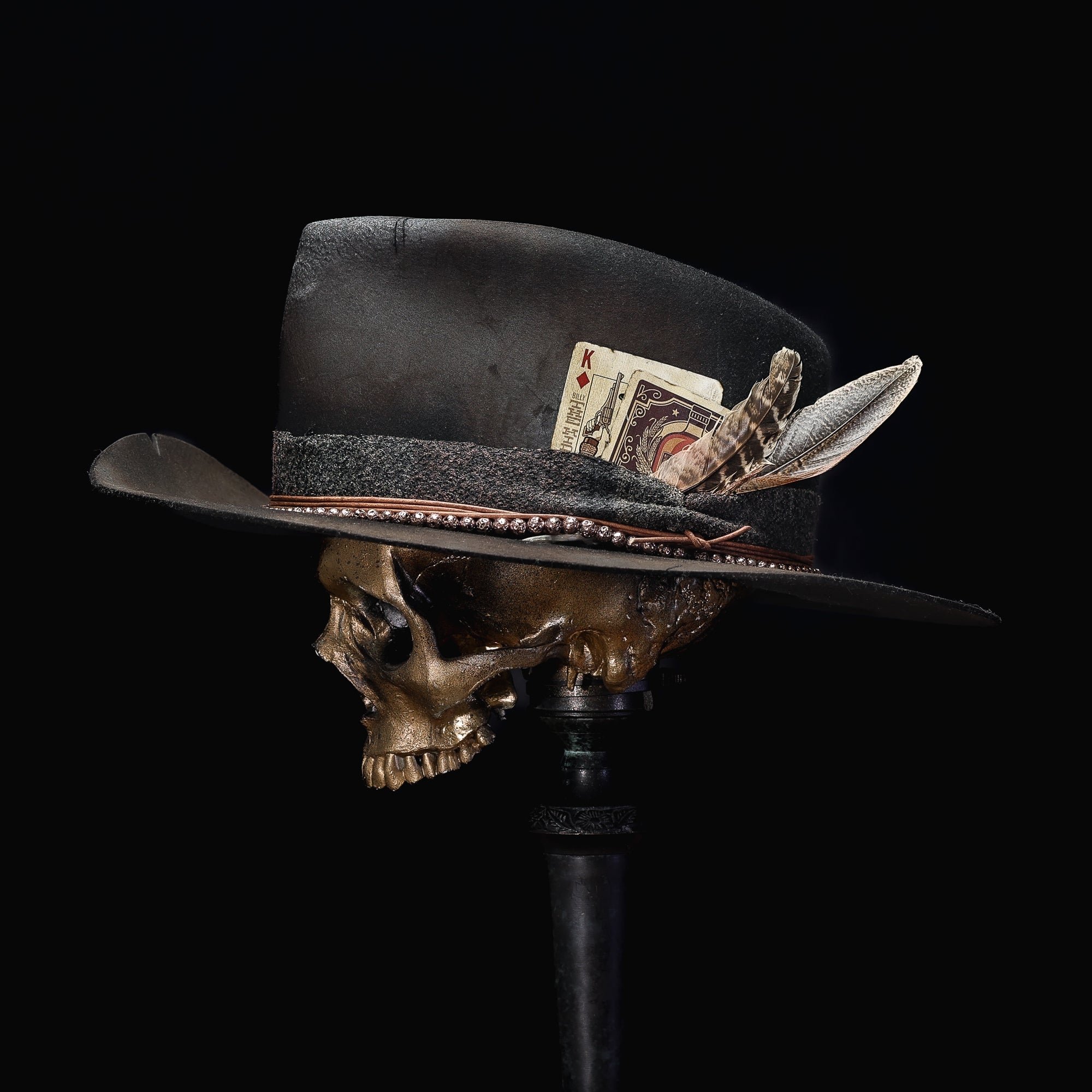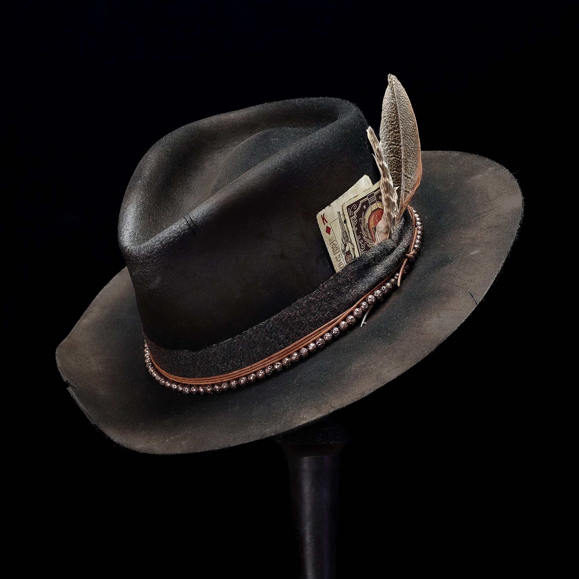 A short brim tall crown Teardrop in Black European Hare with a Marksman Curl on the brim. Wrapped in upholstery fabric, leather cord, and copper beads. Finished with a double card (including a Billy the Kid and king of diamonds) and feather detail.