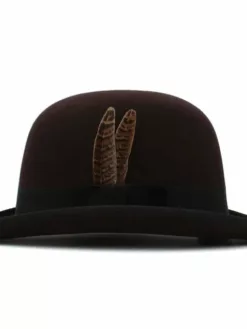 Elevate your style with our exquisite Bowler hat, adorned with a feather-accented hatband. This timeless piece is crafted with precision and boasts a crown height of 4.72 inches, along with a brim width of 1.97 inches. Embrace sophistication and tradition with this classic accessory, perfect for both formal occasions and casual outings. The leather hatband, complemented by delicate feather detailing, adds an extra touch of elegance to this distinguished Bowler hat. Make a statement and elevate your ensemble with our impeccably designed Bowler hat.