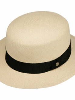 The elegant straw hat the perfect match for summery, light outfits made of linen and flowing cotton.100% decoratively woven Panama straw is complemented by a wide grosgrain ribbon in a contrasting colour and exudes style and taste. The discreet logo complements the classic look. In intense summer sun, the flat brim provides pleasant shade and protects against UV radiation with factor 50.