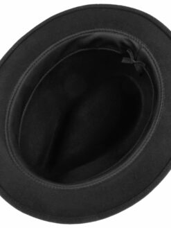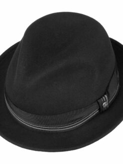 Supple wool felt gives this hat its pleasant feel and, together with a skin-friendly lining made of cotton, makes it comfortable to wear. The plain design of the felt hat with narrow brim is complemented by a subtly striped grosgrain ribbon trim with brand pin, which emphasises the hats neat charm. This trilby can be worn on everyday outings, but also makes a great club hat.