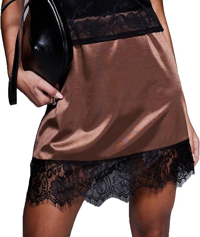 - Features: Elastic waist, solid color, lace trim. Women lace trim a-line skirt, lace silk slip skirt, lace trim mini skirt, y2k low rise lace skirt cute, coquette lace short skirt, satin silk skirt going out, elegant mini satin skirt.